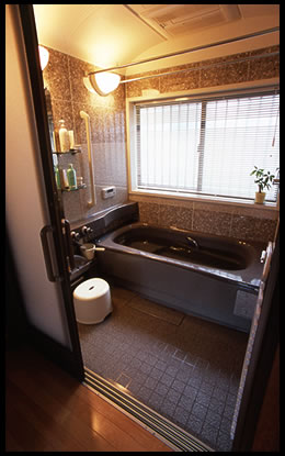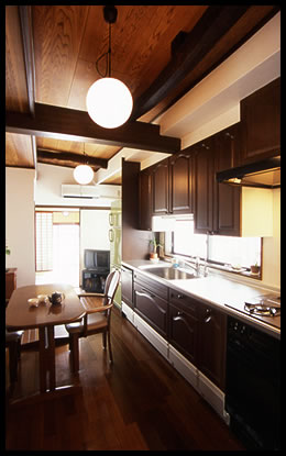 京都、龍安寺近くの昭和初期に建てられた華奢で上品な住まいを、和風デザインの機能的キッチン、ガス温水床暖房ヌック、段差をなくしたバリアフリーの水まわり、再配置され、ガス温水浴室暖房乾燥機カワックのバスルームと小窓を配したトイレ。